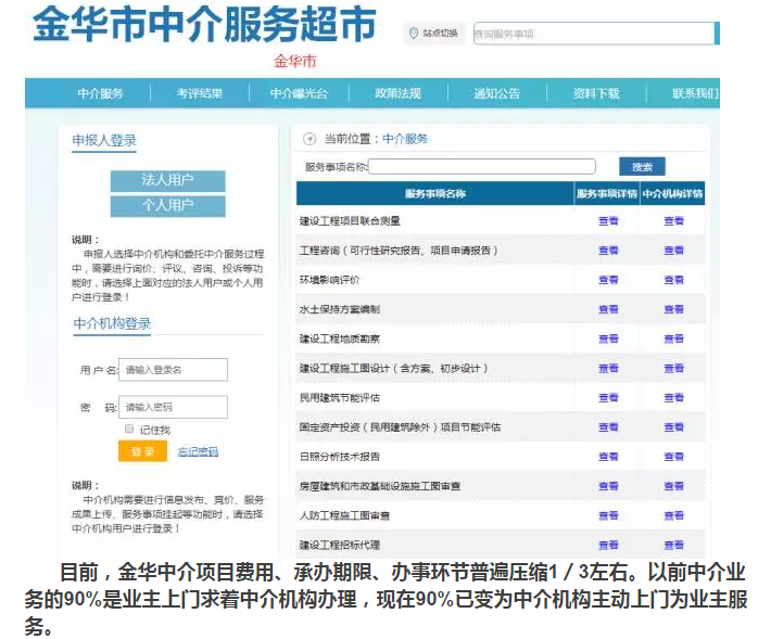 目前,金華中介項目費用、承辦期限、辦事環(huán)節(jié)普遍壓縮1/3左右。以前中介業(yè)務(wù)的90%是業(yè)主上門求著中介機構(gòu)辦理,現(xiàn)在90%已變?yōu)橹薪闄C構(gòu)主動上門為業(yè)主服務(wù)。
