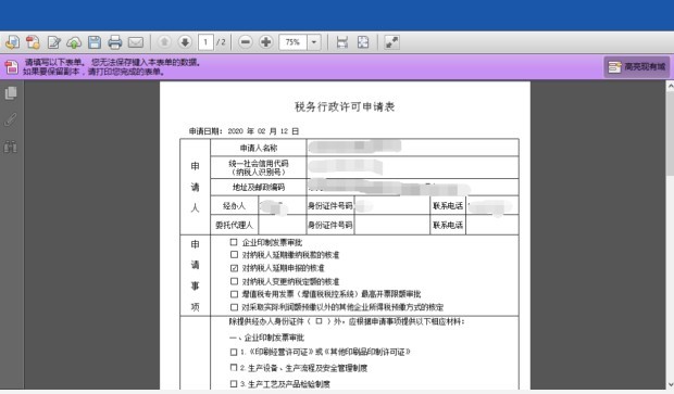 (1)填寫并提交《稅務(wù)行政許可申請表》(列明申請補辦延期申報的正當理由,填寫樣例附后)。