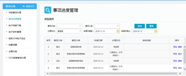 (4)辦理進度查詢。在提交成功后,納稅人可在“我要辦稅—事項辦理—事項進度管理”里查看辦理進度。(可主動與主管稅務(wù)機關(guān)聯(lián)系,告知相關(guān)情況)