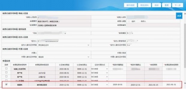 (2)填寫申請信息。在“稅務(wù)行政許可申請”填寫頁面中,按照表單要求填寫相關(guān)信息以及勾選需要延期申報的稅種以及填寫申請延期申報期限等信息。