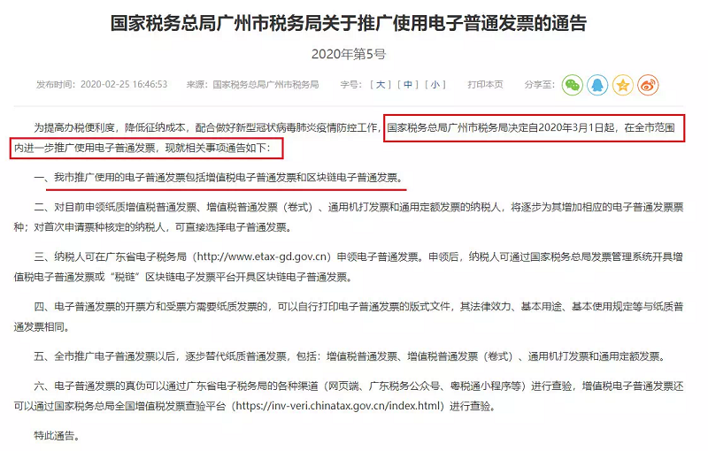 隨后,2月28日廣州市稅務局發(fā)布關(guān)于推廣使用電子普通發(fā)票的通告,自2020年3月1日起,在全市范圍內(nèi)進一步推廣使用電子普通發(fā)票。