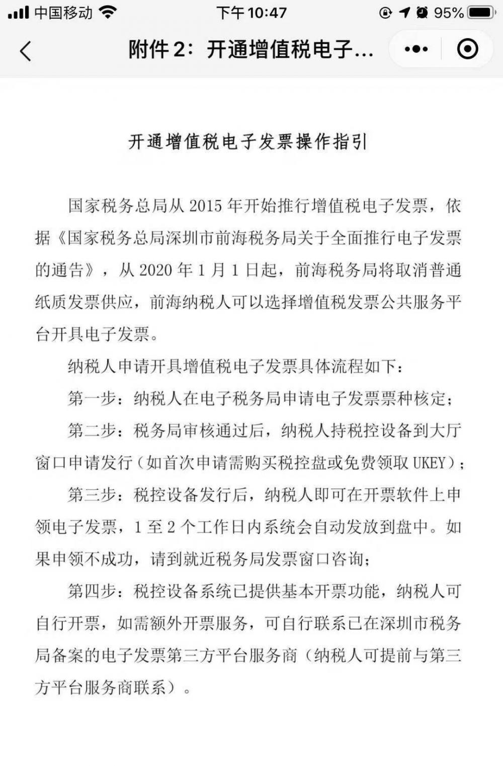 去年,深圳市前海稅務局發(fā)布《關(guān)于全面推行電子發(fā)票的通告》。決定從2019年11月1日起,全面推行電子發(fā)票同時取消紙質(zhì)普通發(fā)票。2020年1月1日起,停止辦理紙質(zhì)普通發(fā)票的申請領(lǐng)購手續(xù)。