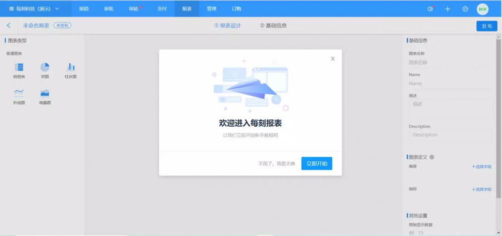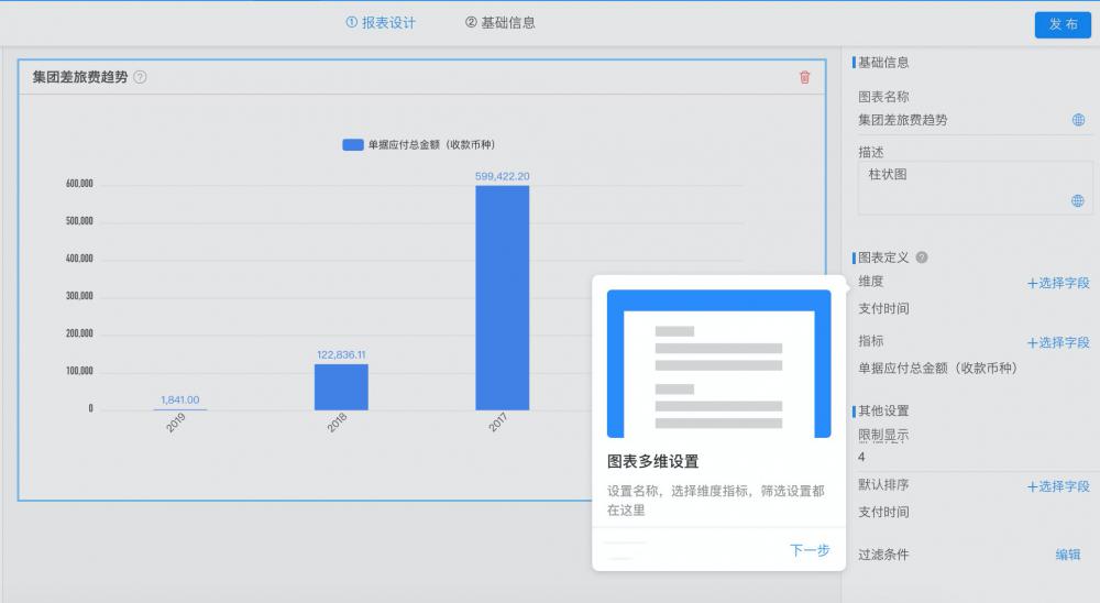具體來說,就是當(dāng)用戶啟動自定義報(bào)表后,可以在每刻報(bào)銷系統(tǒng)中輕松創(chuàng)建圖表,定義數(shù)據(jù)維度,添加數(shù)據(jù)過濾條件,授權(quán)指定員工查看報(bào)表及限定可見數(shù)據(jù)范圍等,幫助用戶從不同維度不同條件分析結(jié)果。