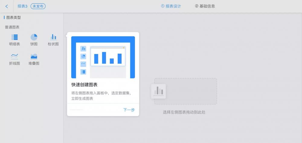 1)新建報(bào)表:當(dāng)用戶啟動自定義報(bào)表后,可以在新建報(bào)表時創(chuàng)建多個不同類型的圖表(目前每刻支持用戶選擇的圖表類型包括折線圖、柱狀圖、餅圖、堆疊圖等等)。用戶在實(shí)際操作中只需要選擇想要的展現(xiàn)形式,拖拽相應(yīng)圖表即可完成第一步的創(chuàng)建步驟。