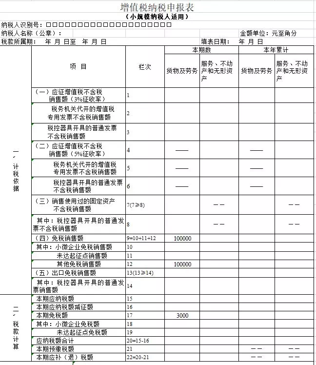 【例6】會(huì)計(jì)頭條農(nóng)貿(mào)有限公司(小規(guī)模納稅人)一季度銷售蔬菜100000元,應(yīng)填申報(bào)表如下: