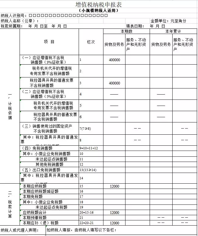 【例2】會(huì)計(jì)頭條有限公司(小規(guī)模納稅人)一季度銷售貨物不含稅務(wù)入400000元,通過(guò)開(kāi)票軟件開(kāi)具增值稅普通發(fā)票,超過(guò)30萬(wàn)不符合小微企業(yè)免征增值稅規(guī)定,應(yīng)填申報(bào)表如下: