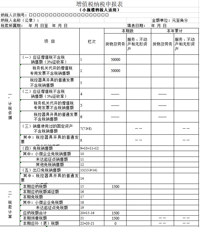 【例3】會(huì)計(jì)頭條有限公司(小規(guī)模納稅人)一季度銷售貨物不含稅務(wù)入50000元,去稅局代開(kāi)了發(fā)票,現(xiàn)場(chǎng)預(yù)繳了稅款,當(dāng)季不超過(guò)30萬(wàn)但是不免增值稅,應(yīng)填申報(bào)表如下: