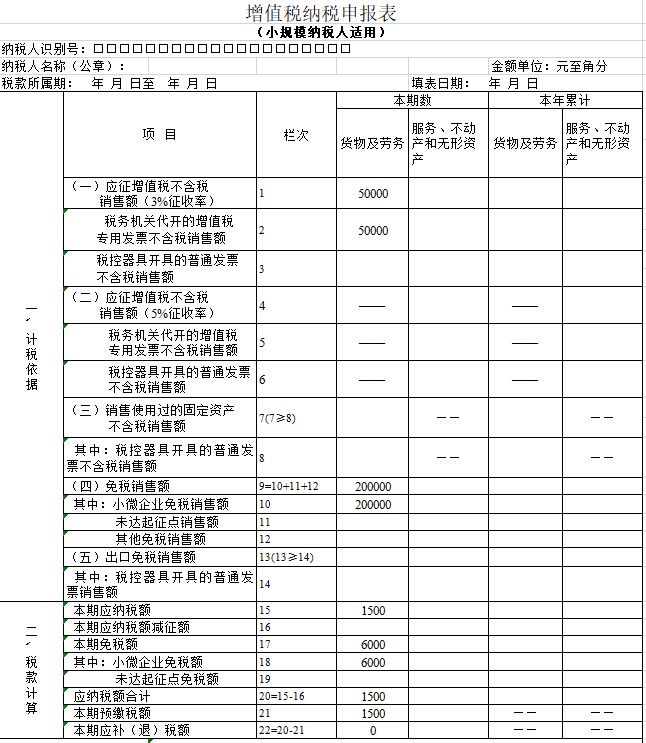 【例1】會(huì)計(jì)頭條有限公司(小規(guī)模納稅人)一季度銷售貨物不含稅務(wù)入50000元,通過(guò)開(kāi)票軟件開(kāi)具增值稅普通發(fā)票,不超過(guò)30萬(wàn)符合小微企業(yè)免征增值稅規(guī)定,應(yīng)填申報(bào)表如下: